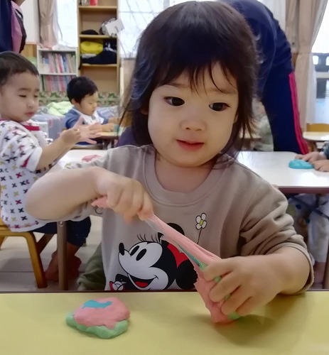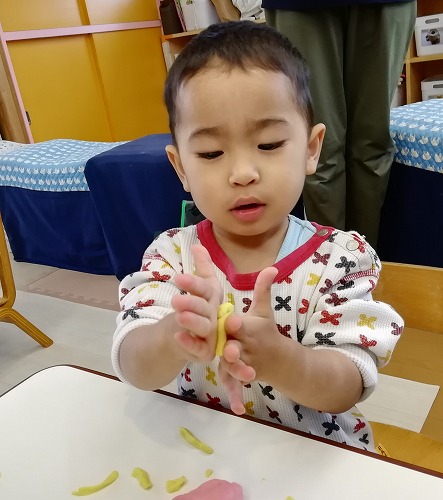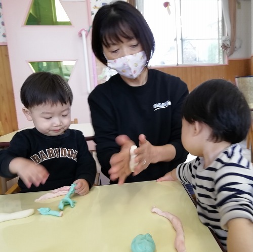 「こ〜ねこね♪」と歌いながら伸ばしている子に、「こねこね、上手だね。先生も作ってみようかな」と言うと、「うん、いいよ」と、さらに張り切って伸ばしていました。