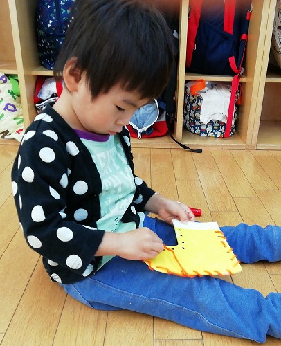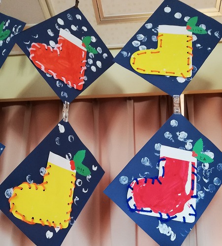 2歳児クラスは、雪に見立ててサツマイモでスタンプをしました。 ブーツ型にカットした台紙のまわりに、ひも通しで模様もつけました。