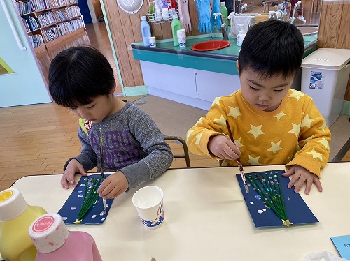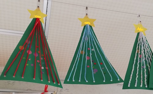 3歳児クラスもひも通しの技法でツリーを作りました。サンタさんへの手紙(カード)には絵の具で雪を降らせて仕上げています。
