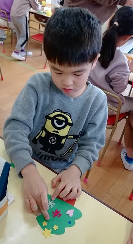 4歳児クラスはツリーにオーナメントをつけて、飛び出すカードを作りました。「「飛び出すカードを作りたい!」と、皆で考えたものです。