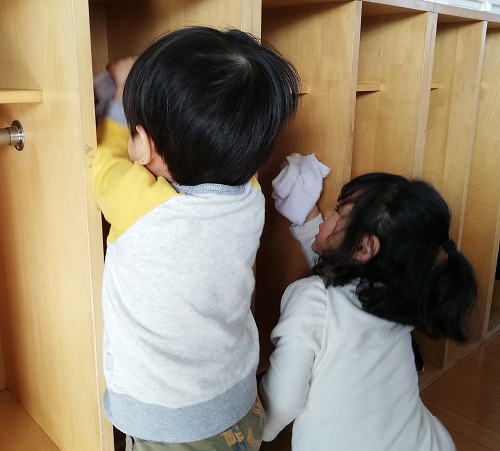 掃除中のお兄さん、お姉さんの姿をみて「何してるの?」と2歳児クラスの子ども達。「お部屋、ピカピカにしてるんだよ」という返答に、自分達の部屋も「きれいにしよう!!」と始まった大掃除。いつも使っているロッカーや床を皆で拭きました。