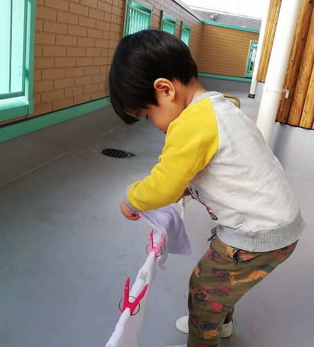 使った雑巾を保育者が干していると「やりたい!!」とやってきて、「自分で!」「自分も!」を主張しながら一生懸命取り組んでいます。雑巾の角を使って角を拭くことを考えついた子どももいましたよ!