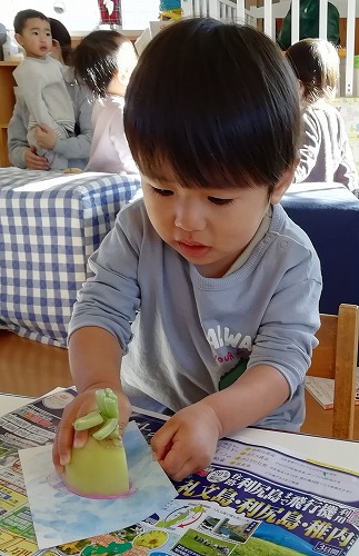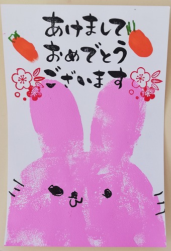 昨年末、それぞれのクラスで年賀状作りをしました。0、1歳クラスは、野菜スタンプで雪ウサギを描きました。1歳児は大根。半月が雪ウサギになりました(写真)。
