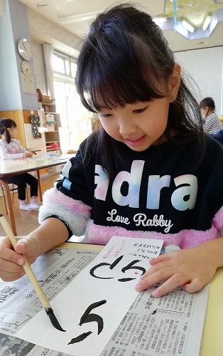 5歳児は、毛筆に挑戦!! うさぎ(卯)の文字を書きました。見本を見て、「こんな形かな?」と言いながら書いています。