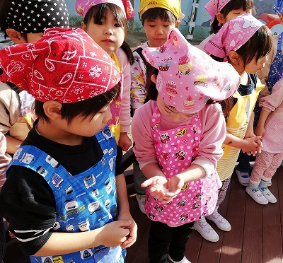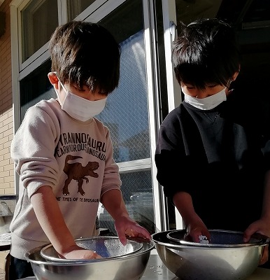 まず前日、もち米を研いで準備をしました。「お家でもお米研ぎ、お手伝いしているよ」「ごはんのお米と同じだね」「でも、なんか、つぶが白いよ」と、子どもたちは観察していました。言いながら、もち米を研いで準備をしました。