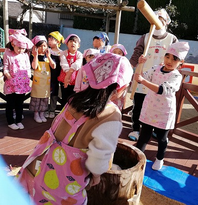 新しい年、柏鳳保育園では5歳児クラスが、新年をお祝いする餅つきをしました。