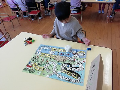 保育者が「私が子どもの頃は、こんなふうに遊んだんだよ」と話すと、さっそく「やってみたい!!」とコーナーに分かれ、福笑い、コマ回し、かるた、すごろくをし、外では凧あげもしました。