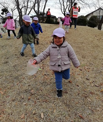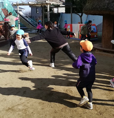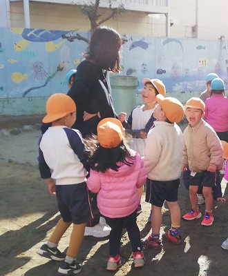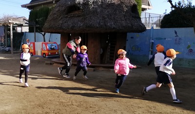 「寒さに負けない体作り」を目標に、今年も11月から始まったハッスルタイム。この日の4歳児、5歳児クラスの子ども達は、保育者との鬼ごっこで駆けまわりました。ルールは簡単で、「鬼(保育者)にタッチされたら、所定の場所で待つ」です。保育者は、全員をつかまえる意気込みで皆を追いかけ、子どもたちは、保育者の動きを見ながら左右へ逃げ回ります。