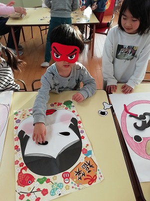 一番の人気は、福笑いでした。目隠をして、友達の言葉を聞きながら、目、鼻、口を置いていくと…。 目を開けて、できあがった表情にみんな大笑いです。「私も!」「僕もやりたい!!」と交代しながら何度も遊んでいました。
