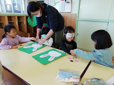 3歳児は、今年の干支であるうさぎの福笑いをしました。