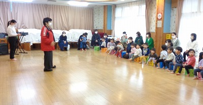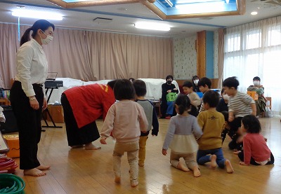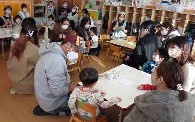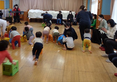 感染対策をして、3年ぶりに0、1、2歳児の保育参観を行いました。保護者の視線を感じながらも、いつものように音楽リズムを楽しむ子ども達。「見てて! できたよ!」と言わんばかりの表情を見せながら取り組んでいます。