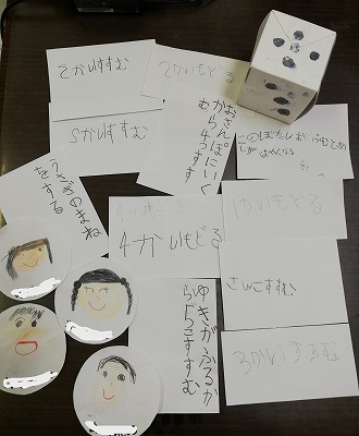 子どもたち自身が「どうやって作る?」から始め、グループで役割を決めて作ってきました。定番の「3つ進む」「1回やすみ」などだけでなく、「お散歩に行き3つ進む」「うさぎの真似をする」「雪が降ったから5つ進む」など、いろいろな決まりが出てきました。決まりを好きなマス目に置けるように作り、毎日、替えて遊んでいます。