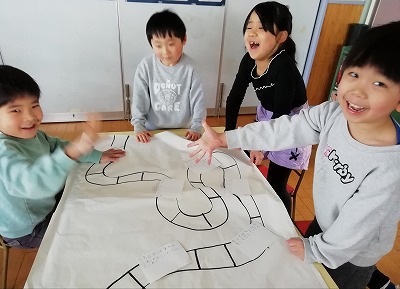 お正月遊びの中で取り組んできた「自分たちのすごろくを作ろう」、ついに完成しました。