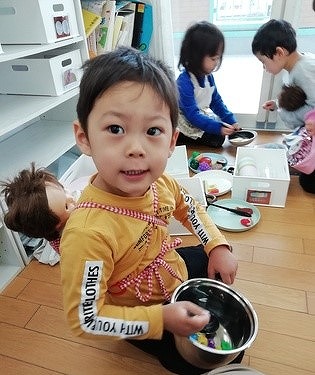 3歳児クラスの子は、おんぶをしてごはんを作っています。このお子さんは、「もうすぐできるよ〜」となべを振り、食事の支度です!