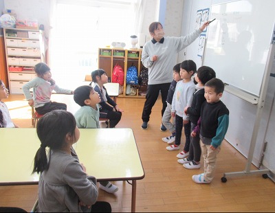 (写真)すみれ組の子どもが、調べたことを保育者と一緒にひまわり組に伝えています。年長児たちは真剣に聞いています。