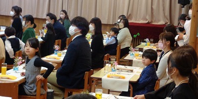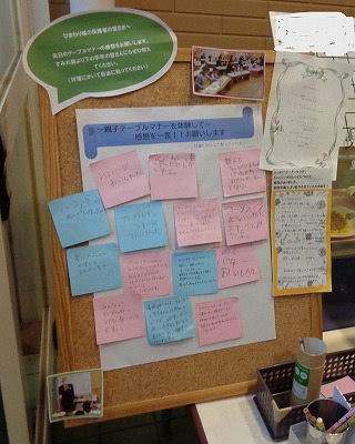 保護者の方からは、「卒園目前に我が子と楽しい時間を過ごせました」「親子でコース料理を味わえて記念になりました」「ドレッシングの作り方を教えてください」などの感想をいただきました。玄関前のボードにも貼り出して、テーブルマナー体験の感想を伝えています。