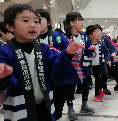 全国統一防火標語を言いながら緊張した表情で入場した子ども達ですが、まわりの声援に応えるように、次第に笑顔になり、元気よく発表することができました。ソーラン節の「どっこいしょ!どっこいしょ!」「ソーラン!ソーラン!」の掛け声が会場いっぱいに広がり、お客さんと一緒にまつりを盛り上げました。