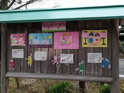 保育園に入ると、植え込みに掲示板があります。ここには、子ども達の作品やお知らせを掲示しています。