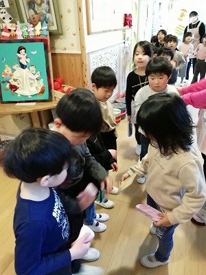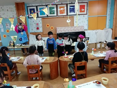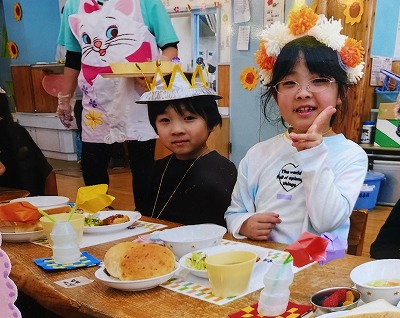年長児(ひまわり組)へ贈る「カレーパーティ」と「おわかれ会」の企画をした年中児(すみれ組)は、自分たちの考えたことが形になり、何より、ひまわり組のみんなが喜んでくれたことに大満足です。