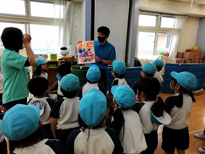 年長児からは「みんなで一緒に遊んでね」と手作り玩具を各クラスにもらいました。もらった子どもたちは、「ひまわりさんってすごいね!」と玩具を手にして話していました。