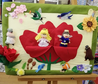 卒園式当日、コサージュ(自分の顔を描いた)と発表会で行った「おやゆび姫」のタペストリーが皆をお出迎え。