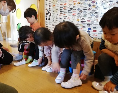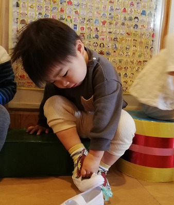 2歳児クラスはこれまで過ごしてきた1階から2階に移ります。うわばきを履いて2階の部屋へ移動。履けるかな…。かかとに付けてもらったヒモをひっぱって、履きます。