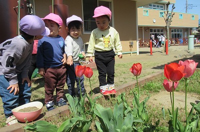 園庭では、「お花、きれいだね」と、小さいクラスの子の顔をのぞきこみながら、声をかける3歳児クラスの子どもの姿も見られました。