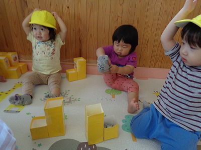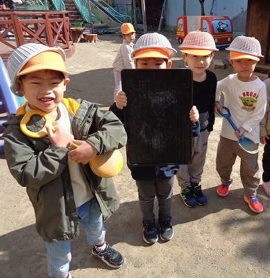 園庭で、「先生〜、見てみて〜」と子ども達の声が聞こえてきました。振り返ると、玩具を帽子に見立て、探検隊になりきり、立っています。そして、大きな声で「探検に行ってきます!!」。