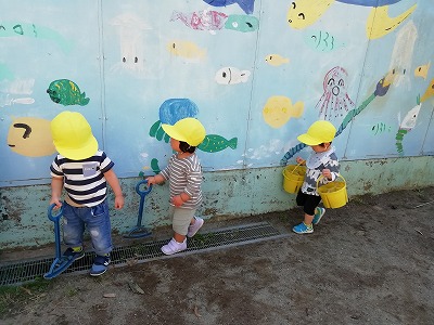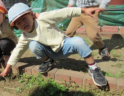 この日は、シャベルを持って、壁沿いをみんなで歩き始めました。上のクラスの子ども達の虫探しの様子を真似たのが始まりです。小さな探険隊が誕生しました。この年齢の子どもは、模倣(まねっこ)遊びが大好きで、真似からさまざまなことを学んでいきます。