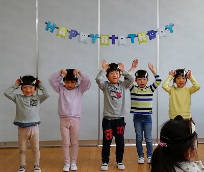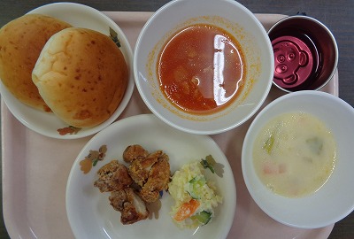 今年の誕生日会の給食メニューは、誕生日の子どもたちのリクエストで決めます。今月は、チーズパン、から揚げ、セレクトスープ(ミネストローネ、または豆乳のスープ)、ポテトサラダ、ゼリーでした。