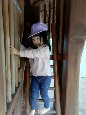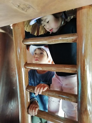 「登る方はこっちだよね」とはしご階段を登って行き、「すごいね。そと見えたよ」「楽しいね」と、会話がはずみます。
