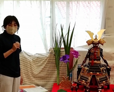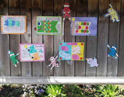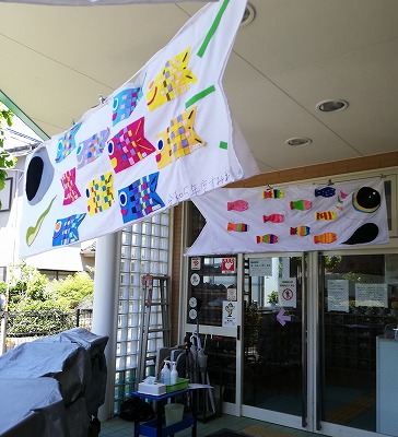 私たちの園では、毎年、クラスで製作したこいのぼりを玄関に飾ります。今年も5匹のこいのぼりが元気に泳ぎ、みんなを出迎えました。門扉から玄関に続く小道には、子どもたちの思いも掲示しました。