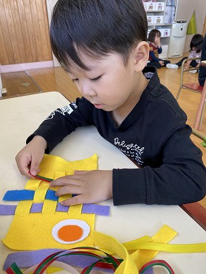 4歳児クラスはうろこ作りをしました。格子編みに集中!! 「う〜え(上)、し〜た(下)」と言いながら編んでいます。