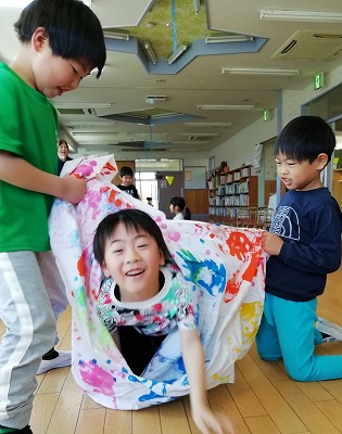 集会では、「こどもの日」の由来を聞き…、そして、歴代の手作りこいのぼりを使ってトンネルくぐり(こいのぼりくぐり)レースも開催しました。ドドドドッ〜(くぐっている足音)。「キャー!」