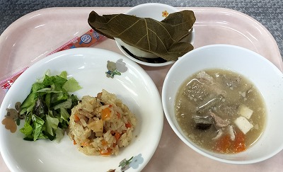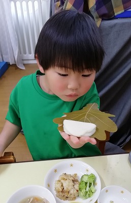 こどもの日の給食です。自分で作った柏餅。柏の葉っぱを、じ〜っと観察しています。