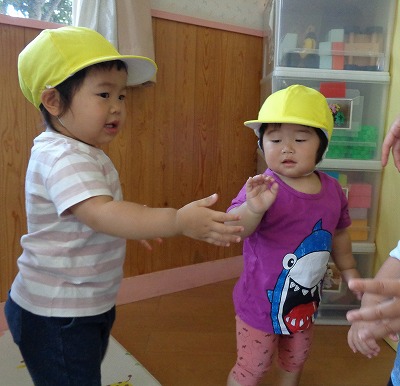 「お庭にいこうか」と声をかけると、1歳児クラスの子どもたちは自分で帽子をかぶり、靴下を履いて外に行く準備を始めます。「お友達と手をつなごうね」と言うと、一緒に行こう!と言わんばかりに友達の手を握ります。手をつないで歩くのも上手になりました。「たんぽぽ組○名、お庭にいってきます〜!」と報告して、園庭に出ます。