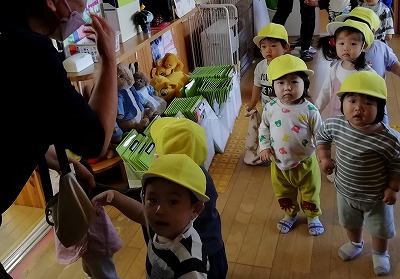 履けると「できた!!」と得意顔。足を指差して見せてくれます。そして、階段をのぼり、保育室へ。みんな、「今日は何をして遊ぼうかな?」という顔をしています。