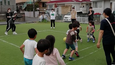 保育参観の内容は、子ども達と企画しました。お買い物ごっこやドッヂボール大会など、親子で一緒に取り組むものと、体操やダンスなど、保護者の方に見てもらいたいものを組み入れました。写真は、ひまわり組(5歳児)の親子ドッヂボール大会です。「絶対勝つ!」と頑張った子ども達です。
