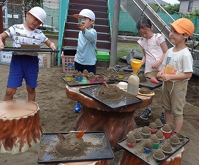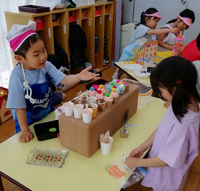 夕方には、幼児組でもアイス作りが始まりました。あっという間にいろいろな種類のアイスができ、「写真撮って〜」とリクエスト!! アイスケーキやカップアイスは種類が全部違うとのこと、ひとつひとつ一生懸命、説明してくれました。