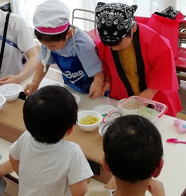 ぴかぴかラーメンでは、年長児みんながお店屋さんになり、他クラスへ呼び込みにいきました。お客さん(3歳児クラス)は、お兄さん、お姉さんがラーメンを作る様子に釘づけです。