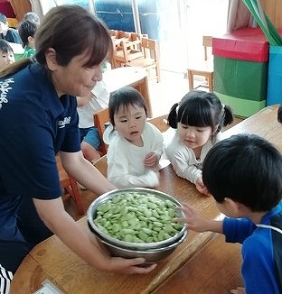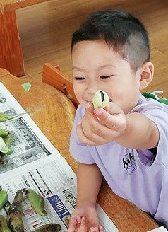 むき方を聞いて、早速むきはじめた子ども達ですが、最初はさやが固くてなかなかむけずにいました。でも、コツをつかむと次々にむきながら「中が真っ白!! 『そらまめくんのベッド』と同じだね」「できた!!」と嬉しそうに見せてくれました。 皆で向いたそら豆は、その日のおやつに食べました。ちょっぴり苦手と言っていた子どもも、ひと口食べてみて「やわらかくておいしい」と話していました。