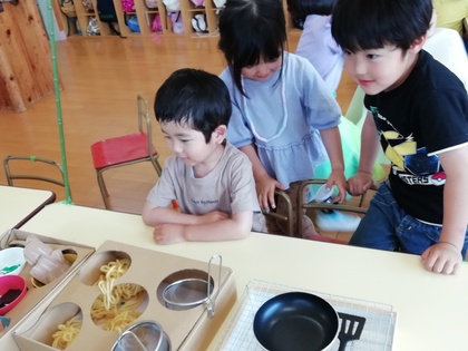 素材集めの中で毛糸を見つけると、「ラーメン、できましたよ〜」と遊びが始まり、「ねぎもつくろう」「ぎょうざもほしい」と次々に作りたいものが出てきました。