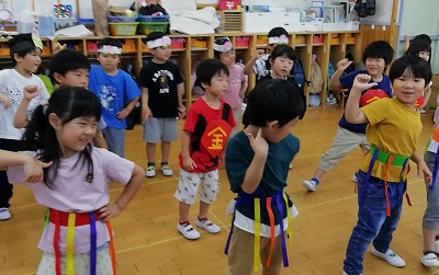 外遊びが難しくなる暑い季節、室内でも、体を大きく動かす遊びをしています。