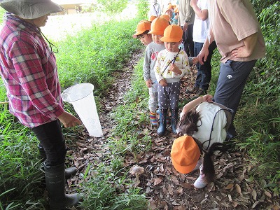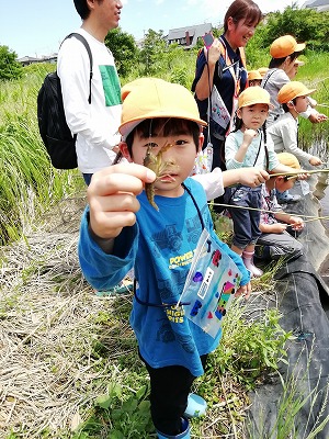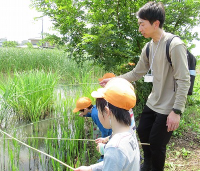 そして、ザリガニ釣りも。長い竹棒に糸をつけた竿をたらし、動かさないように待っていると、すぐに釣れました。初めてという子どももいて、釣れた時は大喜びでした!