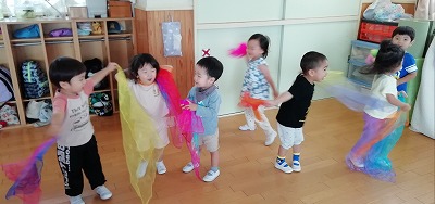 2歳児クラスの子ども達は、布を使うダンスや体操が大好きです。今は、保育シンガーソングライター荒巻シャケさんの『ぐるぐるヘリコプター』や『にんじゃのたっきゅうびん』が一番人気です。