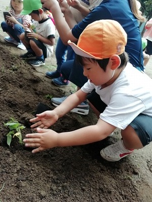 この日、園庭から4歳、5歳の子どもたちの話し声が聞こえてきました。ミニトマト、オクラ、アサガオの種をまき、苗を植えながら、「大きくなってね!」と優しく土をかけていました。