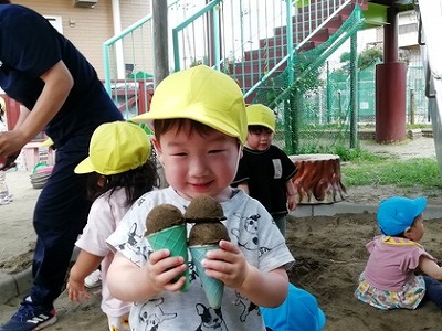 砂場の方からは、「アイス〜」と1歳児の子が駆け寄ってきました。手には、型抜きを持っています。砂場に戻り、「バニラアイスです」「いちご!」「いちごも作る?」「うん」と保育者とやりとりをしながら、手いっぱいにアイスを抱えて嬉しそうです。