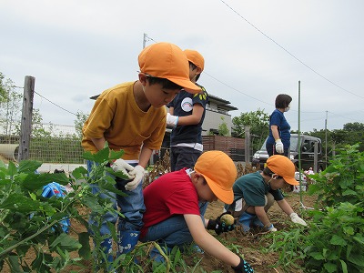 日頃、お世話になっている農家さんの畑に行き、ジャガイモ掘りをしました。 本を見て掘り方を勉強してきた子どもたちは、「土の中にあるジャガイモを全部見つけよう!!」を目標に掘り始めました。