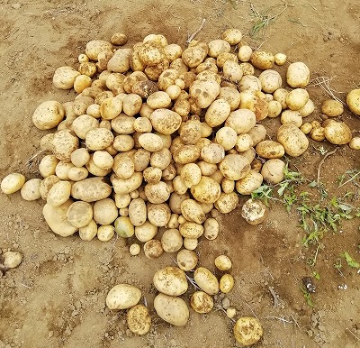 「見つけた!!」「もう少し横も掘った方がいいよ」。次々に出てくるジャガイモを手にして、「こんなに大きいよ!!」「たくさんあるよ〜」「赤ちゃんもあった!」と大興奮。小山ができるほどの収穫でした。
