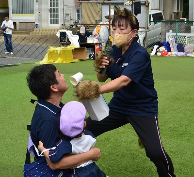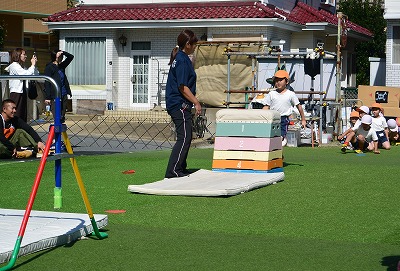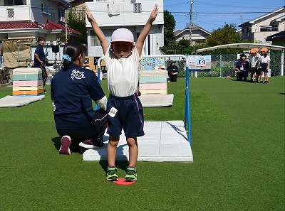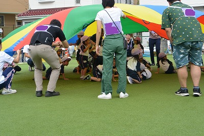 体操種目の跳び箱、 逆上がりは、応援席から「お~!」 と歓声があがりました。心を1つに頑張ってきたバルーン演技や組体操では、そばにいる職員に「今日は手伝わなくて大丈夫だよ」「一人でできるよ、先生」とこっそり言い、頼もしい言葉の通り、堂々と演技しました。皆の成長を感じたうんどうまつりでした。